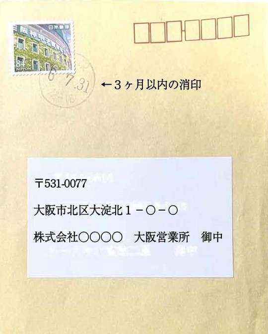 ・大阪支店住所と法人名が記載された3ヶ月以内の消印の付いた郵便物・レターパックのコピー、または公共料金の領収書のコピー